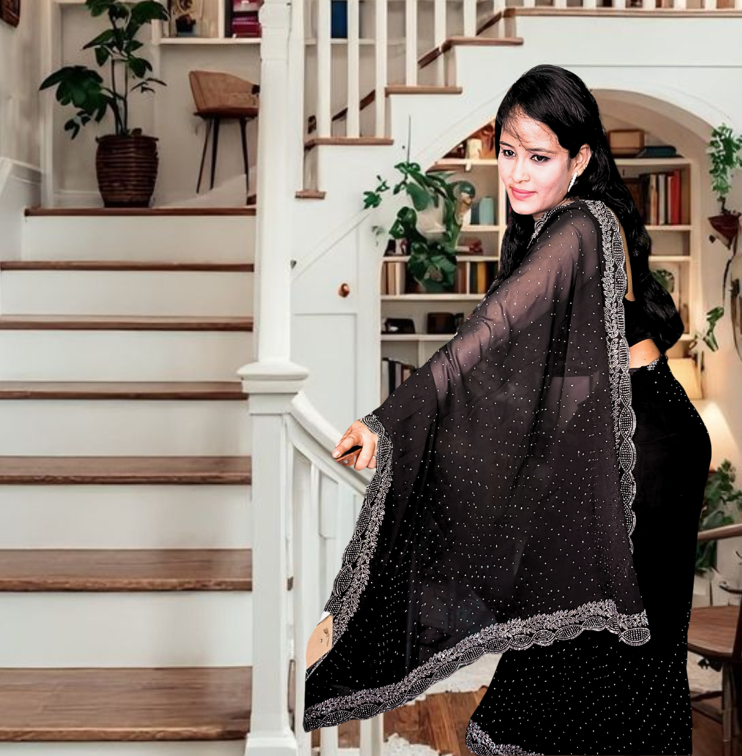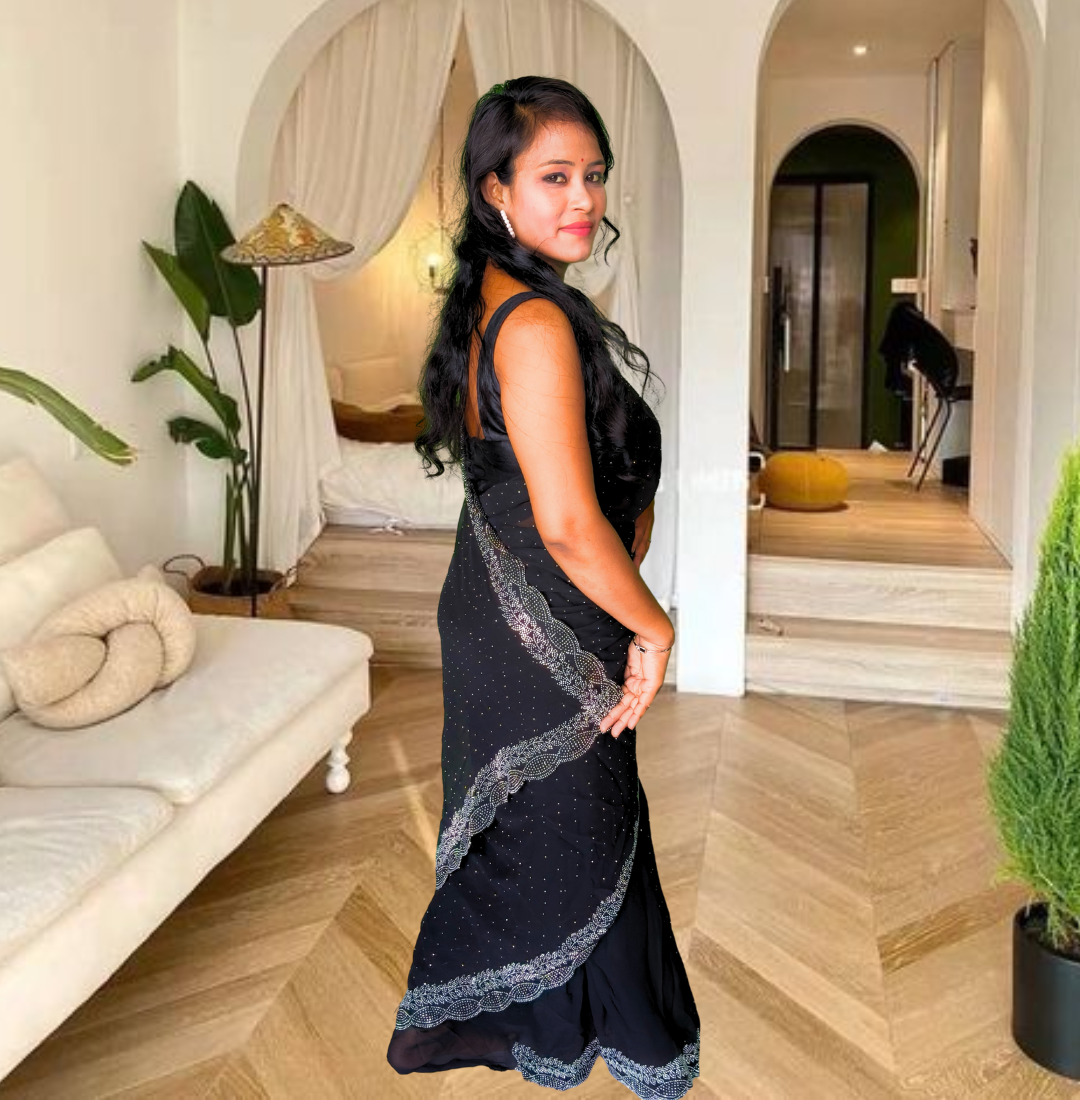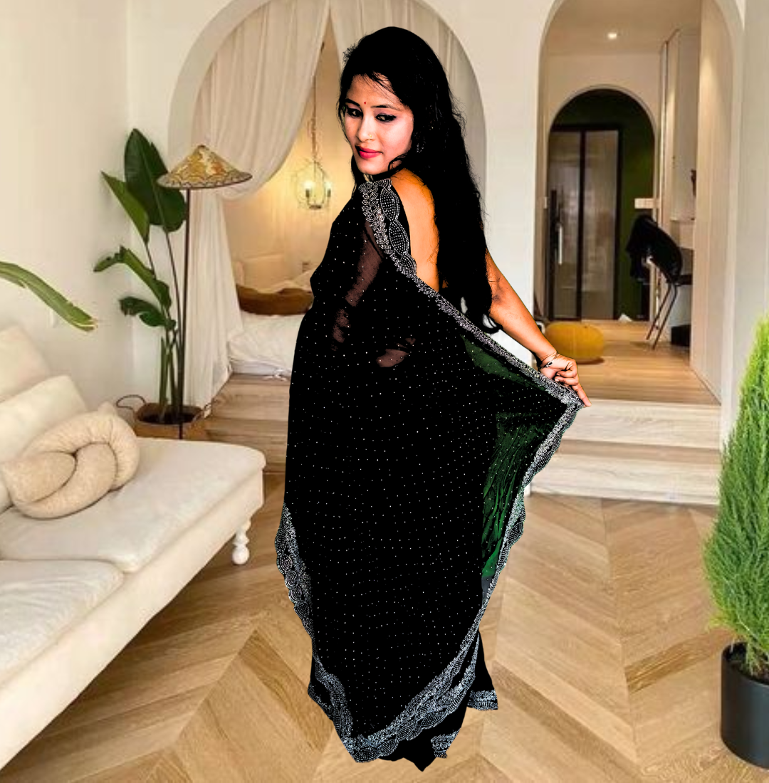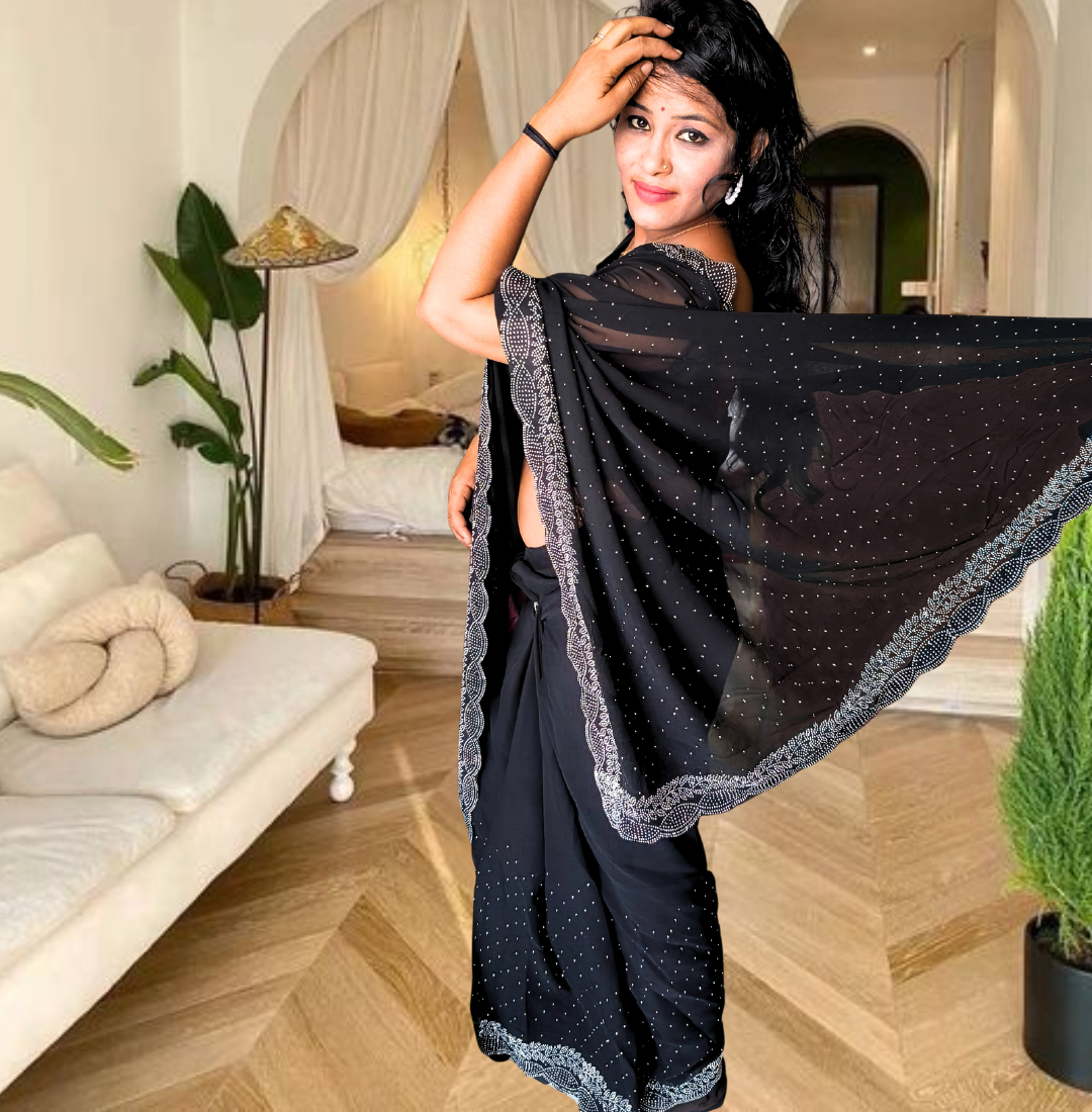| Name : | S4s Black Karishma Siroski Stones Lace Georgette Party Wear Saree |